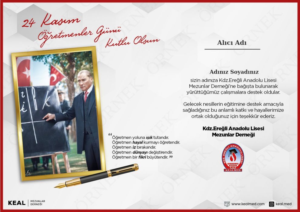 Bu Öğretmenler Günü’nde, değerli öğretmeninizin adıyla KEAL Mezunlar Derneğine bağış yaparak, hem ona unutulmaz bir armağan verebilir hem de öğrencilerimizin geleceğine ışık olabilirsiniz.