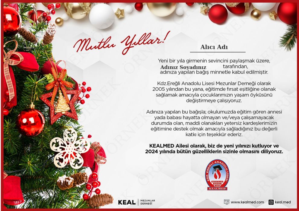 Yeni yıl, umutları tazelemenin ve iyilikle başlamanın tam zamanı! Sevdikleriniz adına KEAL Mezunlar Derneğine yapılacak bir bağış, hem kalplerine dokunan özel bir hediye, hem de öğrencilerimize yeni bir gülümseme olabilir. Yeni yıla iyilikle girin, sevdiklerinize unutulmaz bir anlam armağan edin.