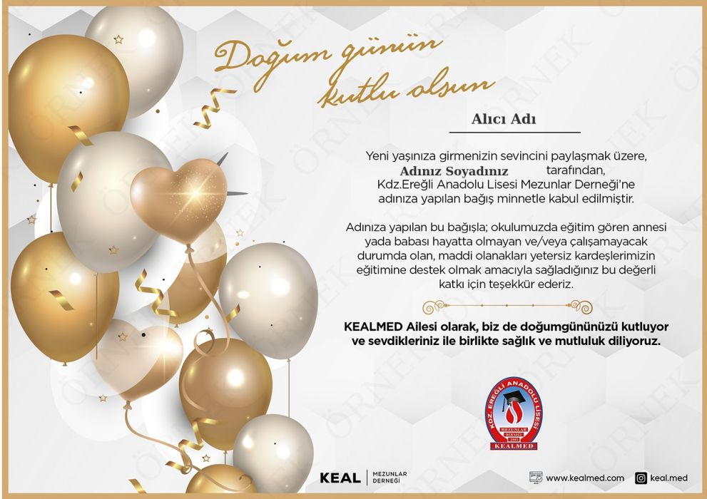 Kutlamalar, paylaşıldıkça güzelleşir… Bu yıl bir doğum gününü daha değerli kılmak isterseniz, sevdikleriniz adına KEAL Mezunlar Derneğine bağış yapabilirsiniz. Hem onlar için ömür boyu hatırlanacak bir jest, hem de öğrencilerimize umut olacak bir iyilik bırakmış olursunuz.